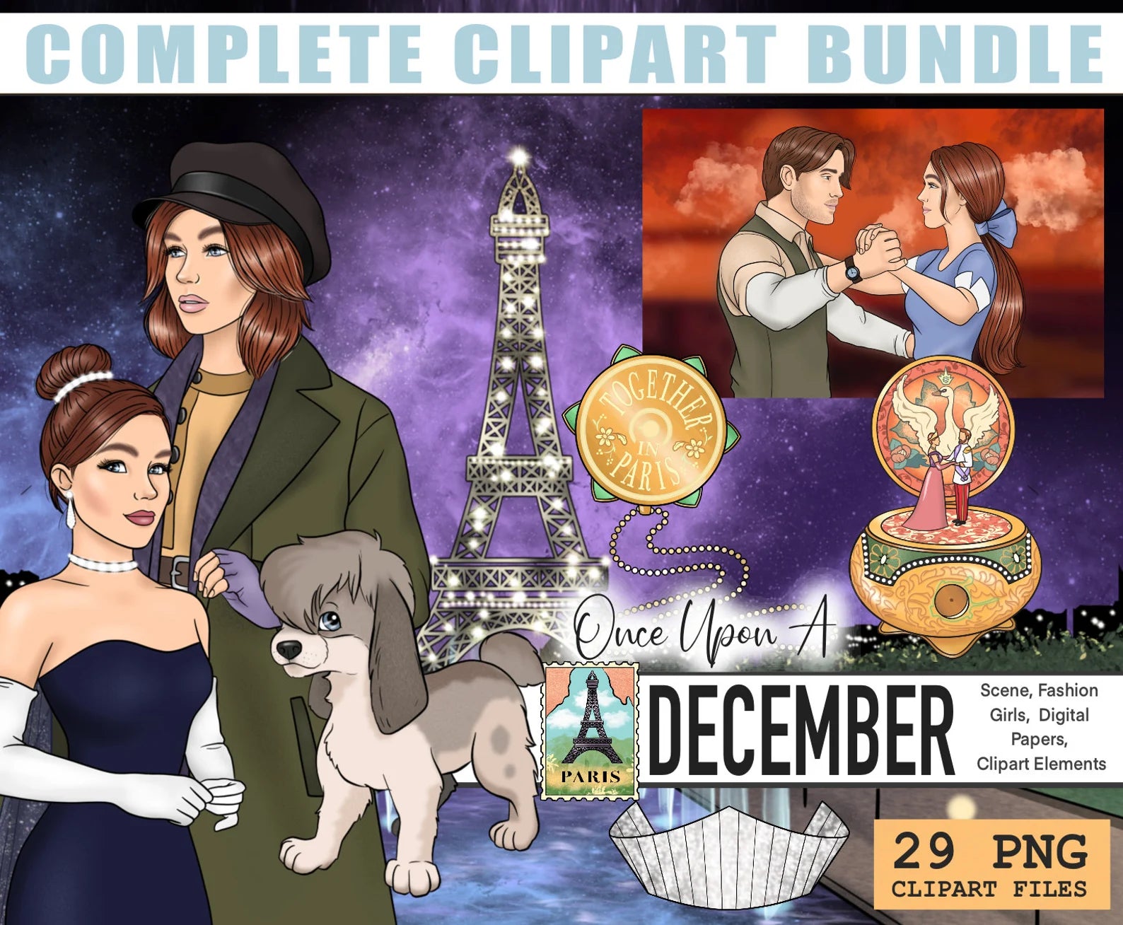 This pack included an assortment of clipart from the shown clipart sets. This is a value pack so while you may not be able to see the exact inclusions in a thumbnail images, be assured that you’ll love all the inclusions! Each pack contains approximately 1-4 fashion people, 1-3 scenes, 8-25 elements and 5-12 digital papers!